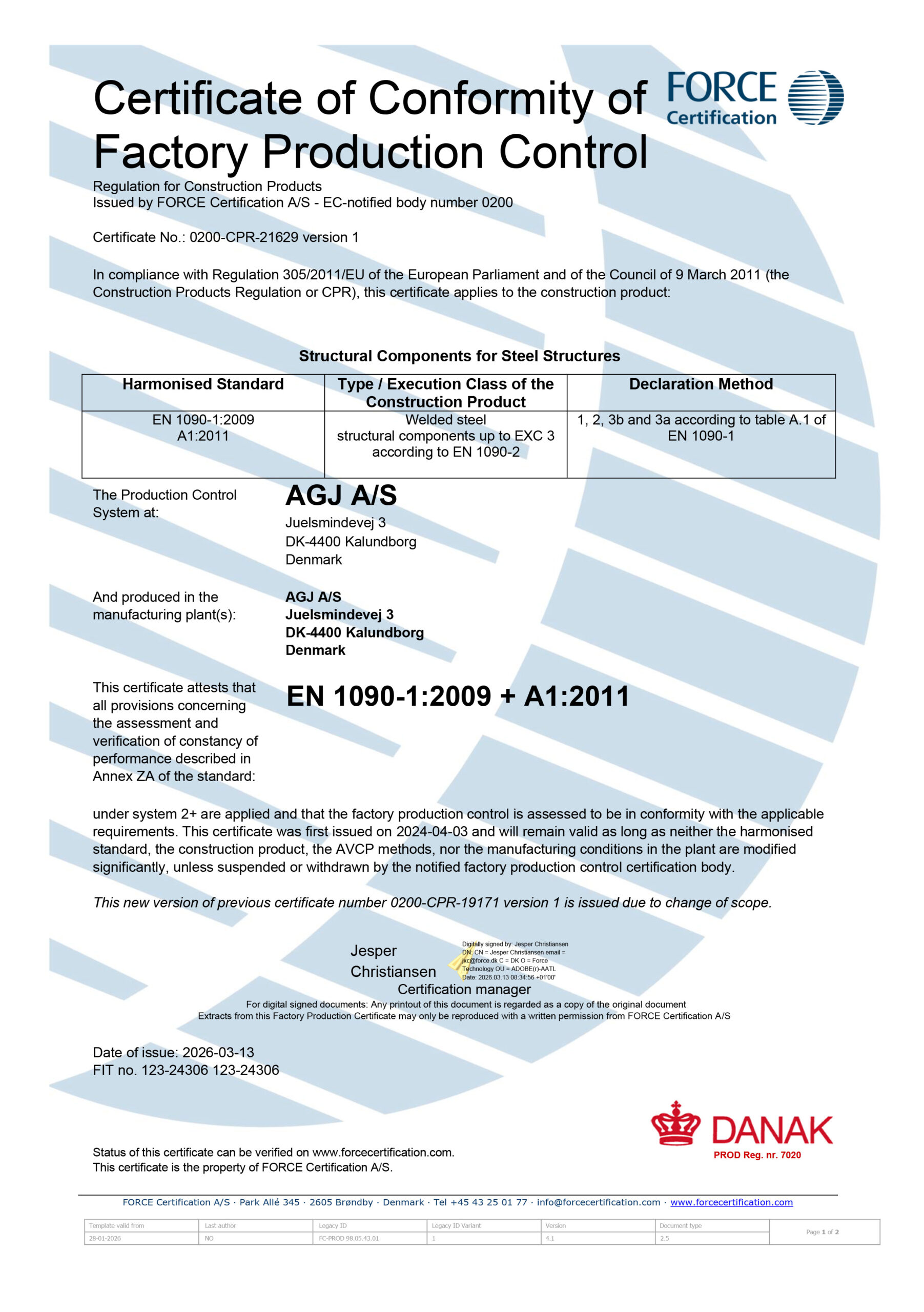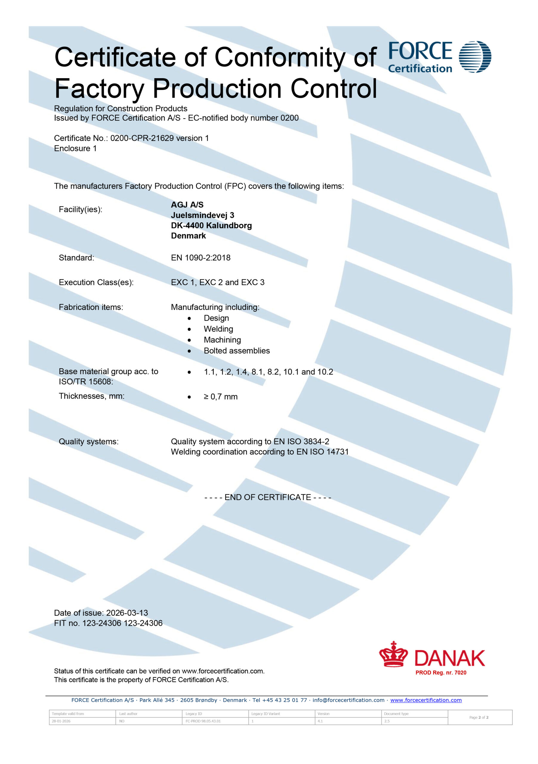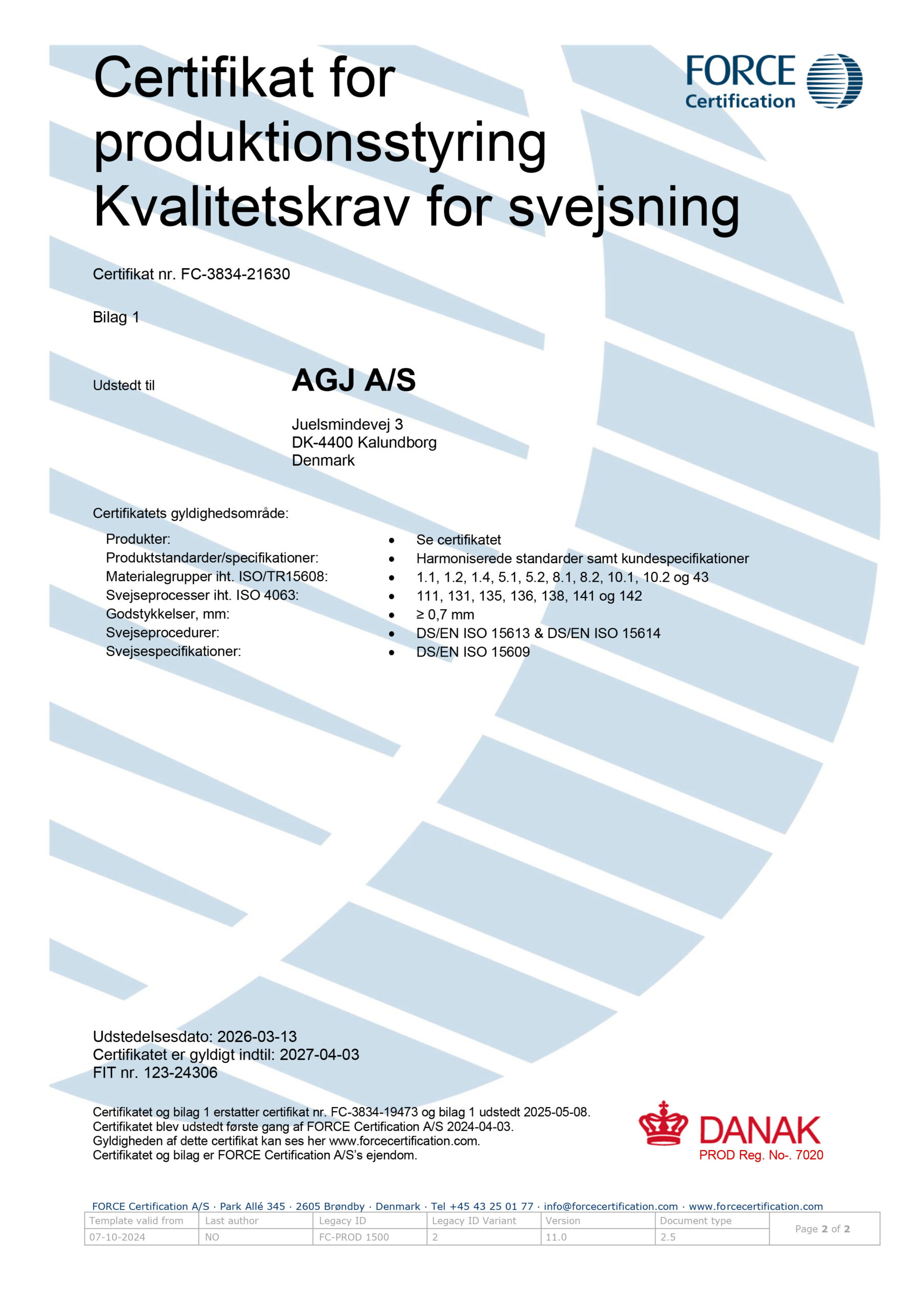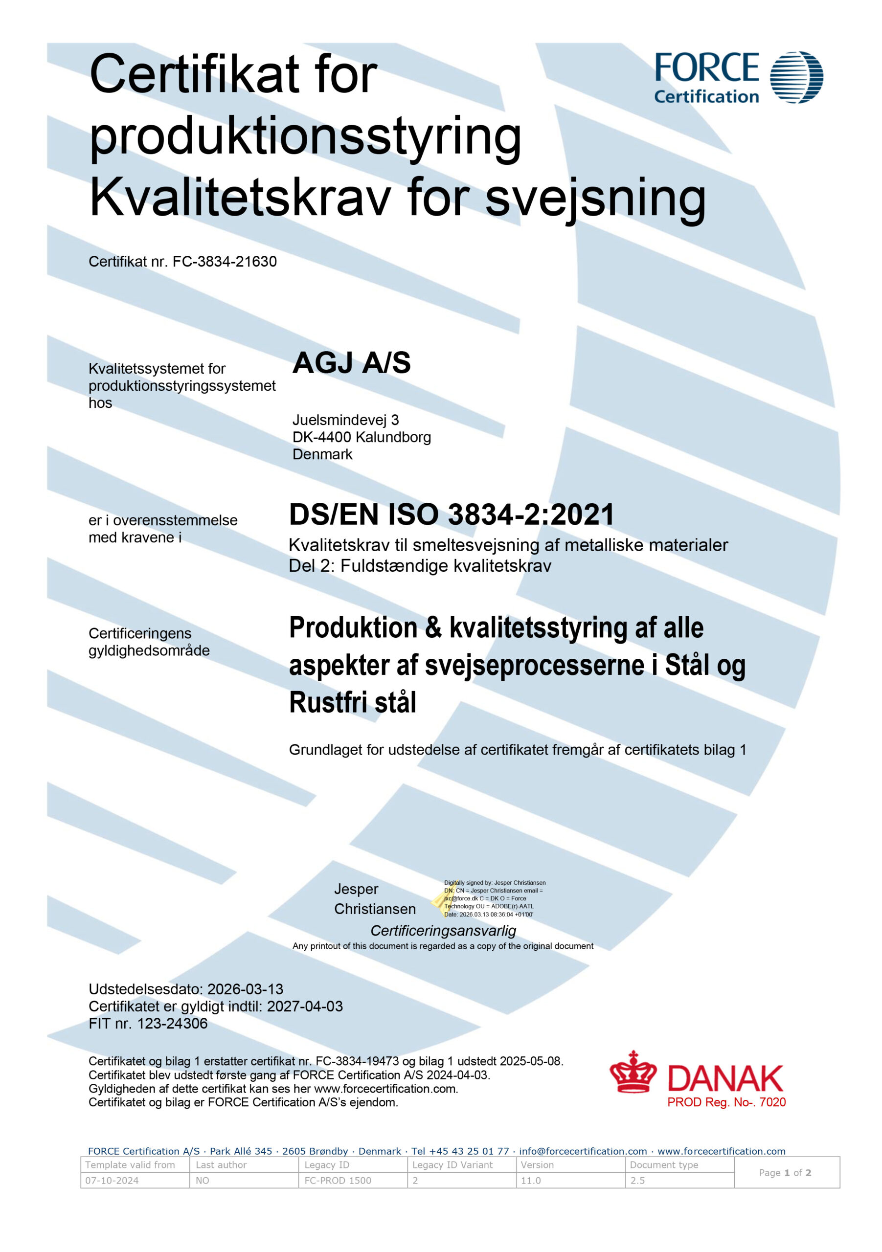 Hos AGJ A/S er kvalitet, sikkerhed og sporbarhed en integreret del af vores arbejde. For at sikre, at vores leverancer lever op til de højeste standarder inden for svejsearbejde og stålkonstruktioner, er vi certificeret efter DS/EN ISO 3834-2 og DS/EN 1090-1 og –2.